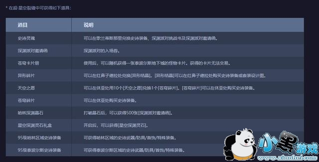 PS:需要注意的是,只有在使用星空深渊灵石才可以进入星空裂缝,星空裂缝在每日6点会重置随机一张哈林地区普通深渊图变为特殊的星空裂缝,还有星空裂缝是覆盖哈林深渊的,所以在这里一样可以获得泰波尔斯史苍穹系列武器。(这里只说主要获得道具,史诗灵魂与门票就不在详细描述)