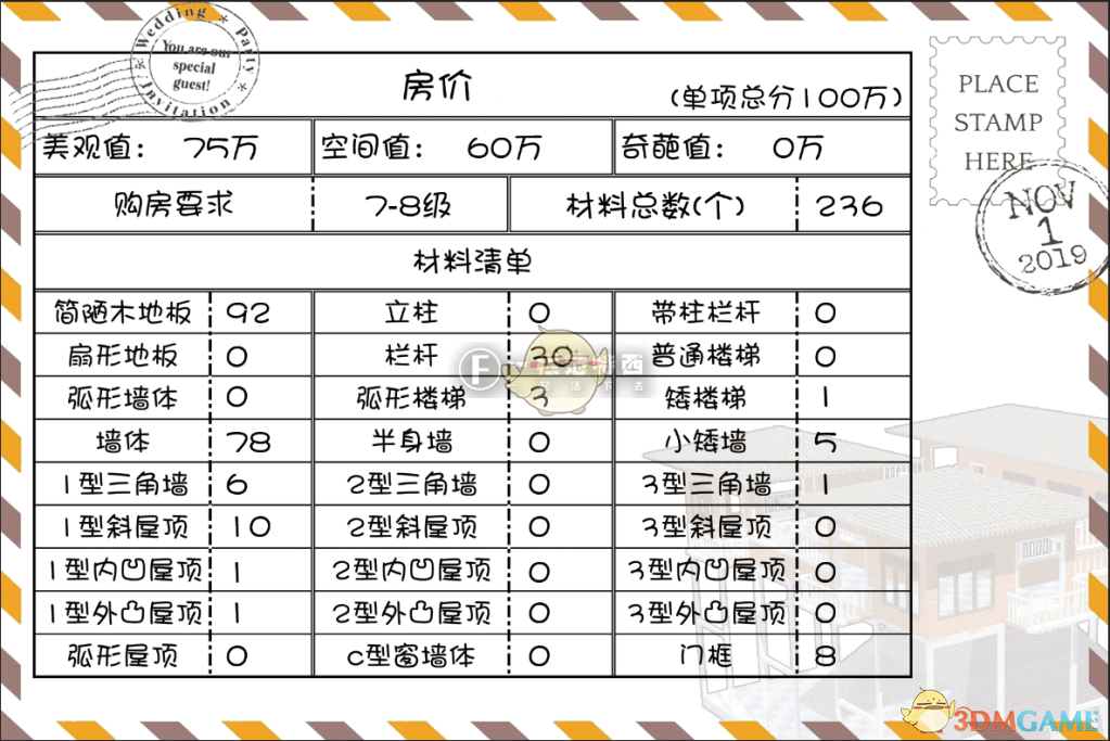 先一起来看看它的建造清单,总数,以及房屋价值吧