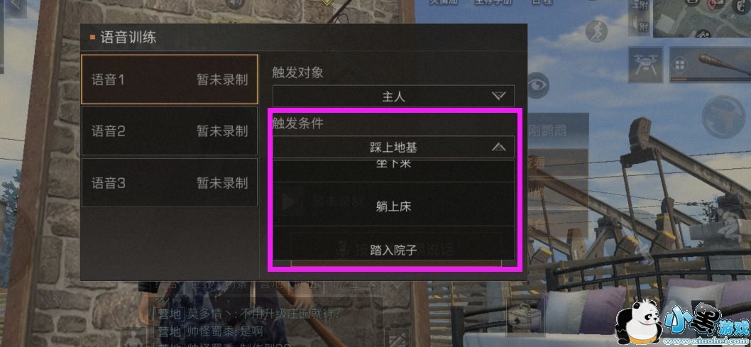 触发条件有:踩在地基、靠近鹦鹉、坐下来、躺上床、踏入院子。