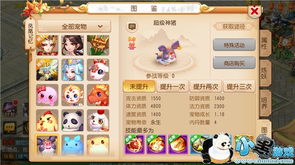和神兽家族其他成员一样,超级神猪可以在场景中跟随玩家,陪伴玩家左右。同时,它的参战等级为0,即任何玩家都可以无视自身等级,呼唤它为自己而战。具有永生寿命的它,还兼具固定的资质、成长和技能数,这也保证了它在战斗中将有稳定的发挥和明确的定位。相信Q萌的超级神猪,一定能以其Q萌的造型和强大的实力,赢得无数玩家的欢心!