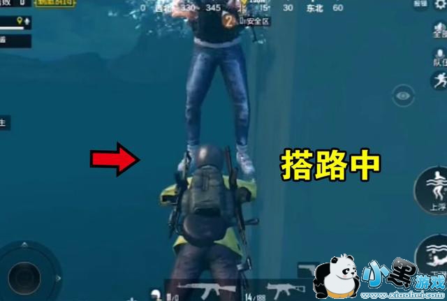 其实正确的方式只要让一个队友潜在水里,然后另一个人就踩在他的身上就行了,如上图所示。如果你看到了水里有敌人,这个时候站在上面的队友可以拿出枪,出其不意的开枪扫射。或者最后一个圈刷了,你也可以在队友身上打大概四五个药包这样,拼毒也有获胜的机会。