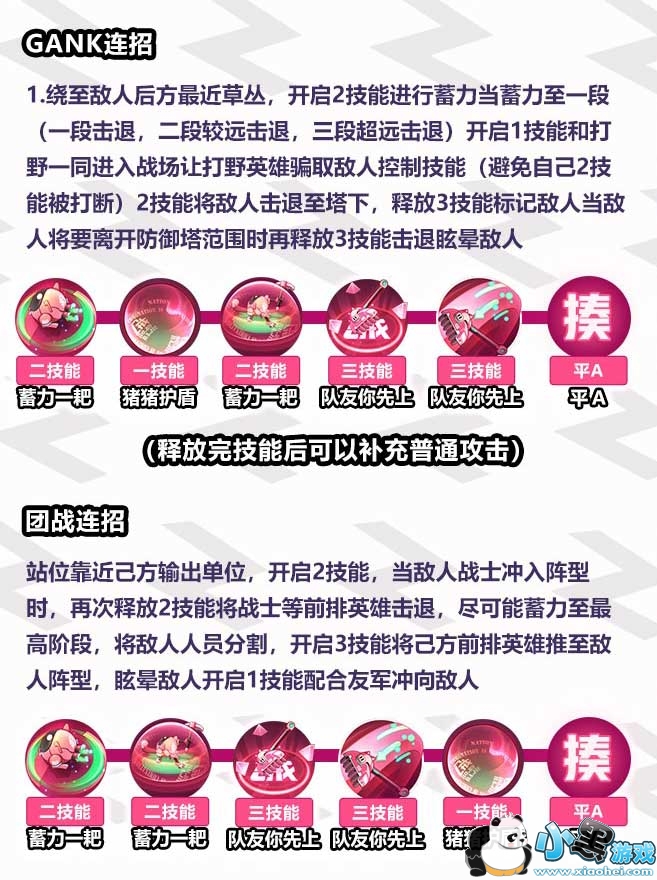 GANK连招:绕至敌人后方最近草丛,开启2技能进行蓄力当蓄力至一段(一段击退,二段较远击退,三段超远击退),开启1技能和打野一同进入战场让打野英雄骗取敌人控制技能(避免自己2技能被打断)。随后2技能将敌人击退至塔下,释放3技能标记敌人。当敌人将要离开防御塔范围时再释放3技能击退眩晕敌人。