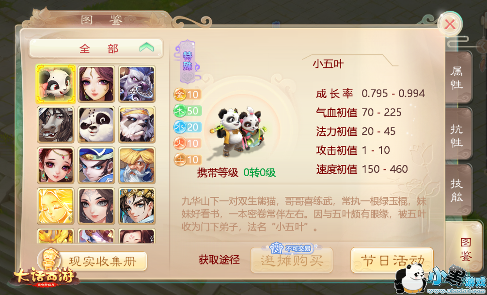传闻九华山下有一对双生熊猫,一男一女煞是乖巧可爱。熊猫哥哥是个武痴,常年手执一根绿玉棍舞得虎虎生风;熊猫妹妹知书达理,最喜读书万卷,一本密卷卷轴常年伴随左右,闲暇时刻拿出来品读一番。兄妹二人慧根不俗,又与五叶颇有眼缘,机缘巧合之下被五叶收为门下弟子,因其双生连枝如影随形,故共用法名“小五叶”。“小五叶”在游戏中的定位敏血型的召唤兽,而且“小五叶”拥有着不俗的速度与气血初值,较高的成长率。