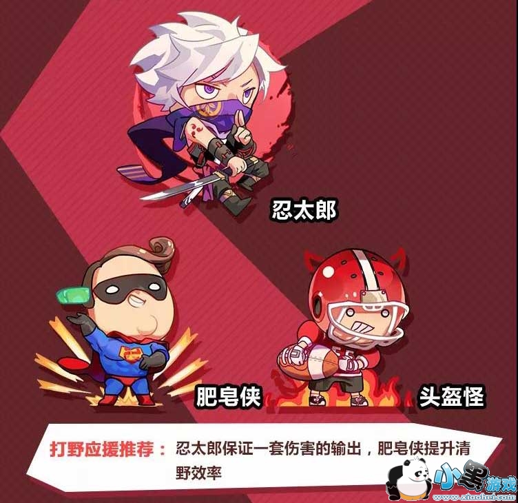 打野应援推荐:团长忍太郎保证一套伤害的输出,副团长头盔怪提供护盾,肥皂侠提升清野效率。团员方面,仍旧推荐选择风车妹、电锯男、持弓汪,堆出一定的物穿,并尽可能依靠技能打出伤害,来保证前期输出。