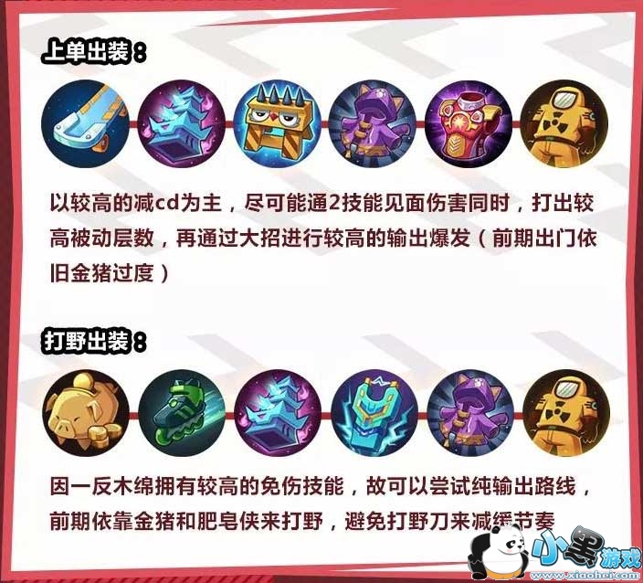 上单推荐出装:金属滑板、琉璃塔、尖刺路障、喵喵冲锋衣、红衣战甲、防辐射服。前期出门依靠金猪过度,然后以较高的减CD为主搭配肉装,尽可能通2技能见面伤害同时,打出较高被动层数,再通过大招进行较高的输出爆发。