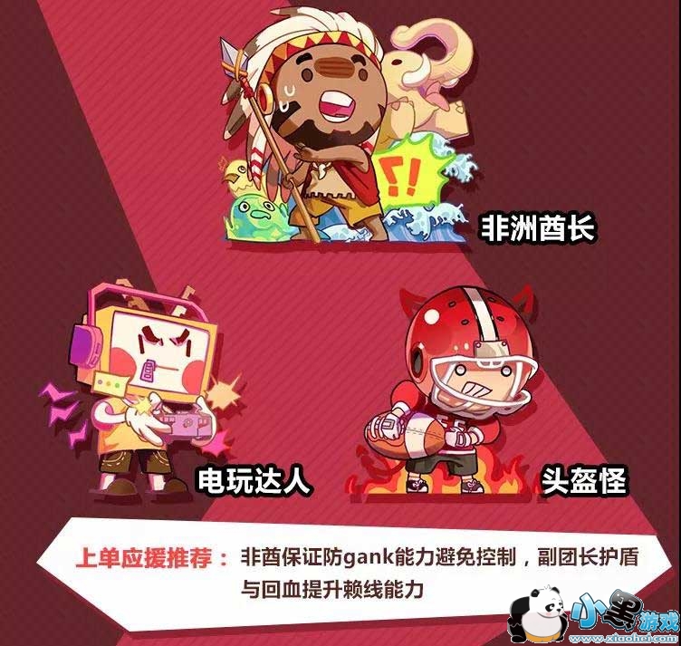 上单应援推荐:非酋避免控制能有效保证防gank能力,副团长头盔怪提供护盾,配合上电玩达人的回血,能有效提升赖线能力。团员方面,以物穿为主,选择风车妹、电锯男、持弓汪来保证前期伤害能力。