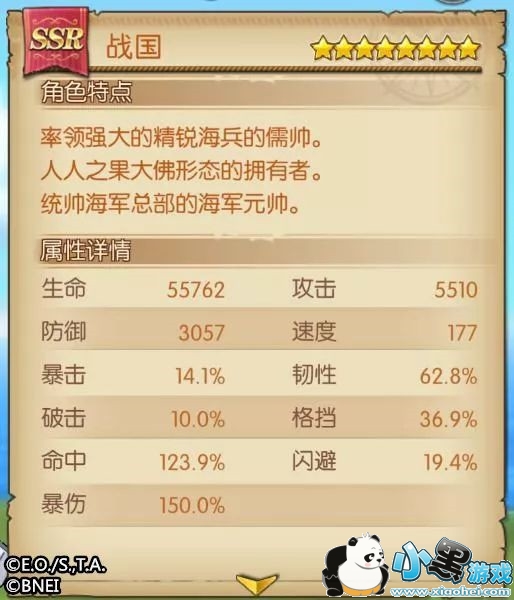 海军元帅:战国自身提高攻击力、防御力与血量,最多增加30%。同时可令阵容中的海军获得伤害减免与伤害提升。最多减免10.5%受到的伤害,提升10.5%造成的伤害。