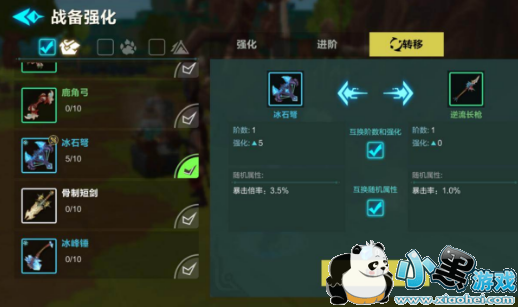 转移:转移能够让我们将某个武器的强化阶段和等级完全转移到另一个武器上。甚至能够转移原本武器上的随机属性。转移系统需要消耗一定比特。