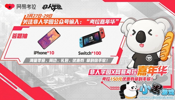 在活动期间,关注非人学园微信公众号输入“考拉嘉年华”即可答题参与抽奖,IPhoneXS、Switch以及海量零食周边礼包优惠券拿到手软!