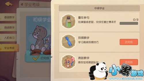 接下来迎接我们的是中级学业,想要取得中级学业证书,就需要小伙伴们完成想应的任务了:1、扮演猫或老鼠,并赢得任意比赛3次;2、完成投掷教学:学习高级投掷技巧;3、完成救助教学:教你如何救助队友。