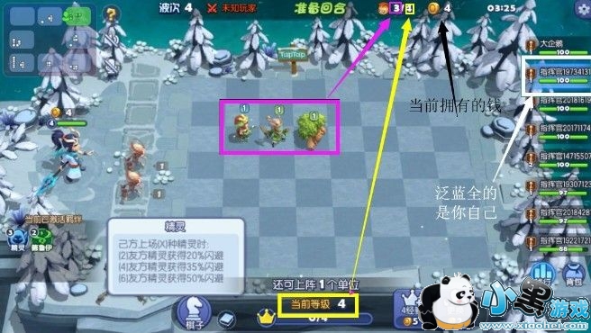 黄框框:可以理解为基地等级,目前4本基地,可以上场的卡牌上线为4。黄框框右边的是花费5个金币升基地,只有4点经验,注意使用!