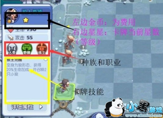 星数:3个1星同样的卡牌,合成一个2星卡牌,3个2星合成一个3星卡牌,卡牌的生命、攻击力、技能相应提高。