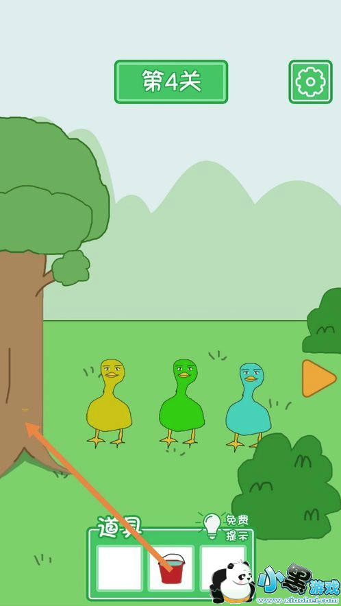答案:先点击绿鸭头上的帽子,接着点击向右箭头到右边去。在右边,将帽子拖动到水桶处,接着将水桶拖动到水中,然后点击向左箭头到左边去。在左边,将水桶拖动到树上黄色的位置就过关了。