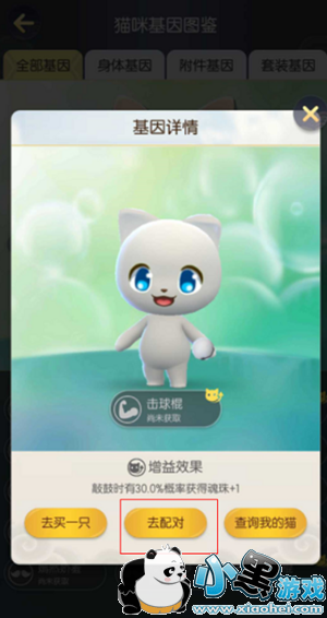 打开基因图鉴,查看基因,字比较大的是你的猫已经拥有的基因,基因上有个猫的图标的就是有功能buff的基因。点击每个基因这可以看到对应的功能描述,然后选择想要获得的基因,可以去市场直接买一只回来,也可以和这种有目的基因的猫进行配对(收费,猫箱和配对费用),然后有概率产生一只带有该基因的猫!