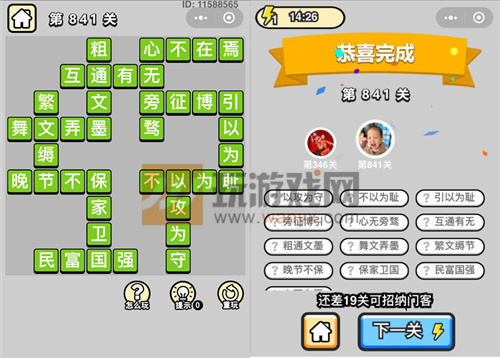 成语升官记是一款益智解谜类的手游,但是玩家在进行费脑的成语解谜游戏的同时,还能体会到模拟养成类的乐趣。从穷书生开始走向人生巅峰。下面小编为大家带来的就是成语升官记第841关的过关答案,一起来看看吧!