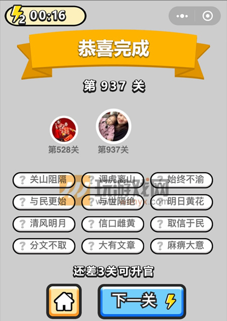 成语升官记是一款益智解谜类的手游,但是玩家在进行费脑的成语解谜游戏的同时,还能体会到模拟养成类的乐趣。从穷书生开始走向人生巅峰。下面小编为大家带来的就是成语升官记第937关的过关答案,一起来看看吧!