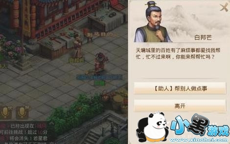 白帮忙的任务每天只能做一次,也是游戏中的每日任务,在天墉城白邦忙领取任务,领取这个任务需要少量的金钱。