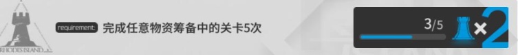 刷素材、龙门币都可以完成物资筹备的任务,但是芯片搜索不算,所以这里我们直接刷5次物资筹备(根据开放的副本来决定刷什么)来完成1次、2次、5次的日常任务,获得总计4枚印章。
