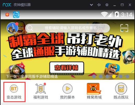 2. 打开模拟器上的游戏蜂窝,点击进入【变态游戏】,下滑找到【全球通服手游辅助精选】