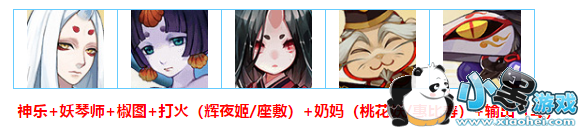 这一套阵容属于均衡稳定输出型,由辉夜姬/座敷负责打火,桃花妖/惠比寿提供足够的奶量,姑获鸟妖琴师负责输出,椒图一直连线,神乐带领团队走向。