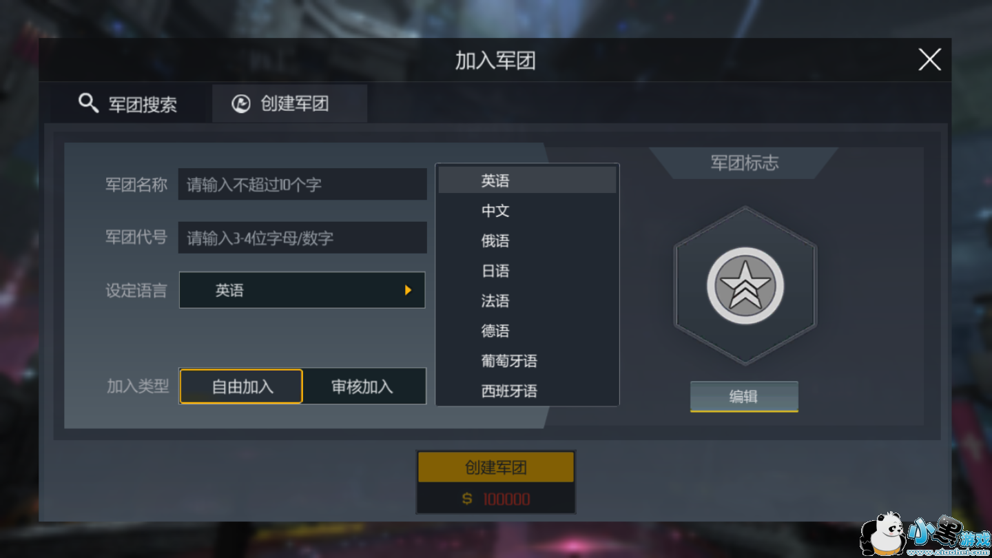 创建军团时需要输入军团名称、军团代号、设定语言、军团标志、以及加入类型,全部填写设置完毕后支付100K联储币即可创建军团。