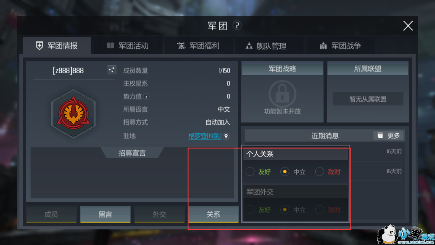 搜索到目标军团后选择“关系”来设定“友好”、“中立”或“敌对”关系。