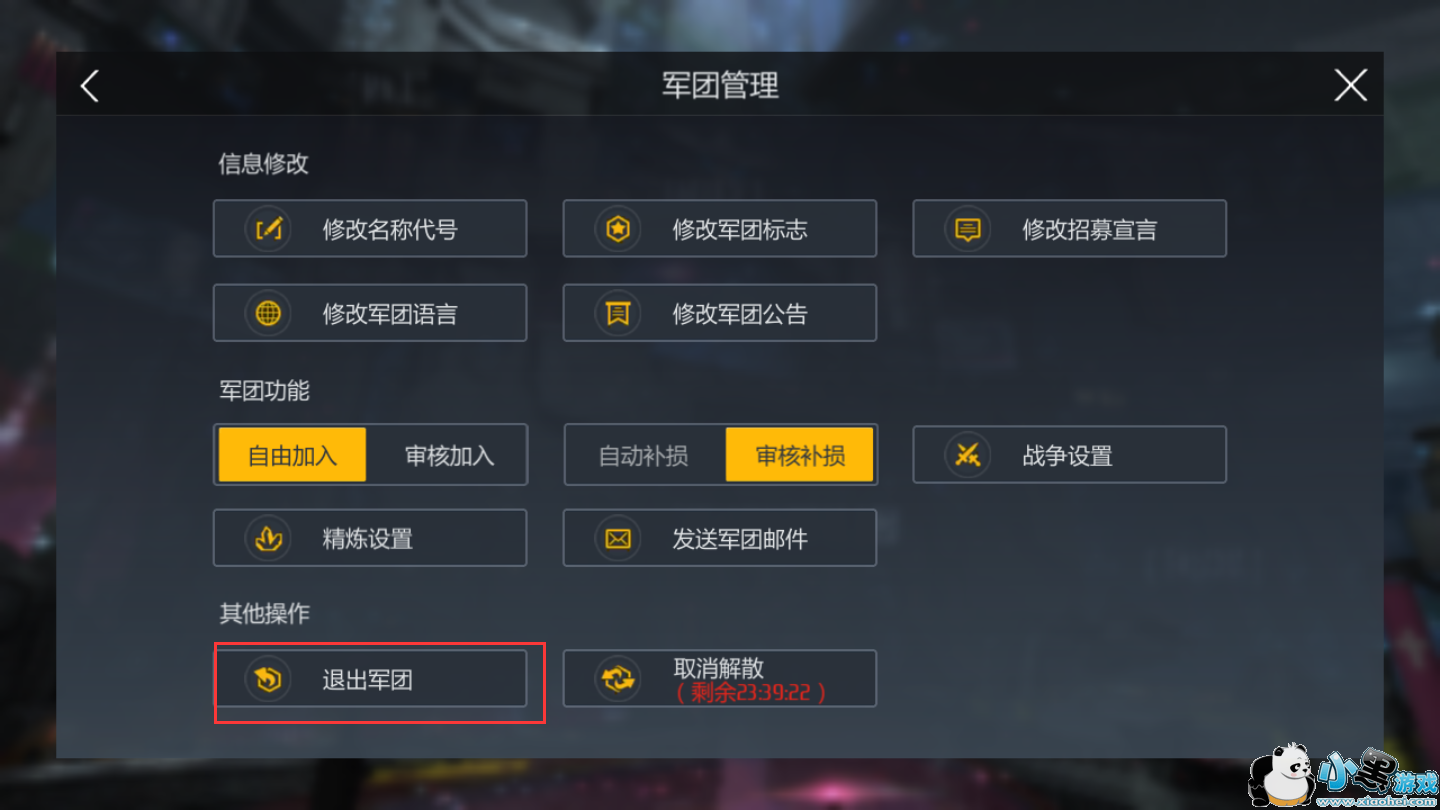 当指挥官需要退出军团时,在军团界面中点击“管理”→“退出军团”。