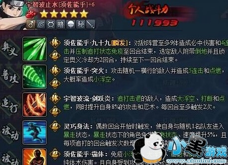 普攻就比较普通了,与秽土鼬的普攻几乎一样,只不过多了随机和点燃,少了必中。5段伤害经过测试也与秽土鼬几乎一致。