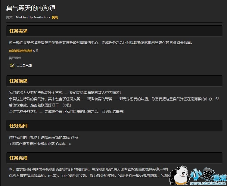 魔兽世界怀旧服臭气熏天的南海镇任务是本次游戏万圣节活动任务之一,还不知道臭气熏天的南海镇任务如何完成的玩家快来看看小黑游戏为大家带来的玩法攻略吧!