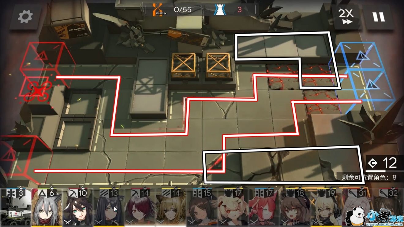 图片中红线是两路怪的路线,白框是两路干员放置的位置,正好是1重装+1奶+2输出,剩余位置放近战,留着下路压力太大后送死。