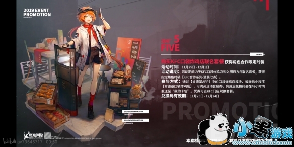 活动说明:活动期间内于KFC口袋炸鸡店购入明日方舟联名套餐,获得指定角色时装【KFC合作系列-清晨七点】。