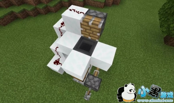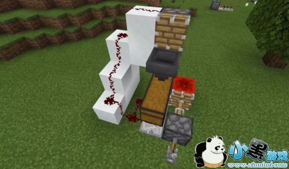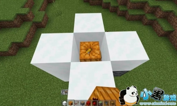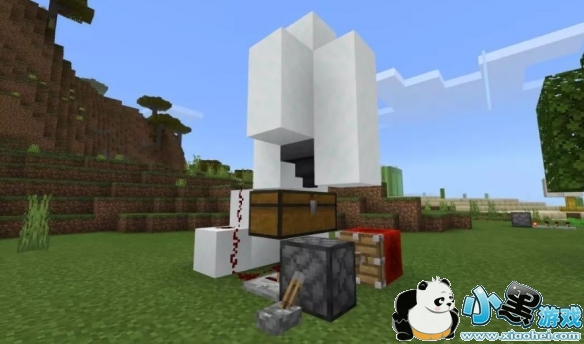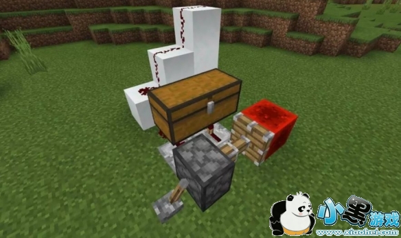 将漏斗对准箱子,并如图放置雪块、活塞和红石。