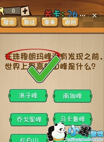通关答案:这一关直接点击题目中的【珠穆朗玛峰】即可。不管这座山之前有没有被发现,他始终还是最高峰!