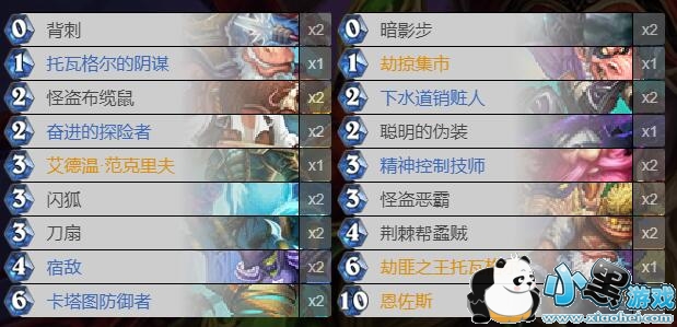 这套卡组与传统带任务的剽窃贼不同,做任务并不是第一要务。实际上,这套牌中能够用来做任务的牌只有一张聪明的伪装、两张闪狐、两张荆棘帮蟊贼(还可以配合暗影步),所以做任务的速度并不会很快。