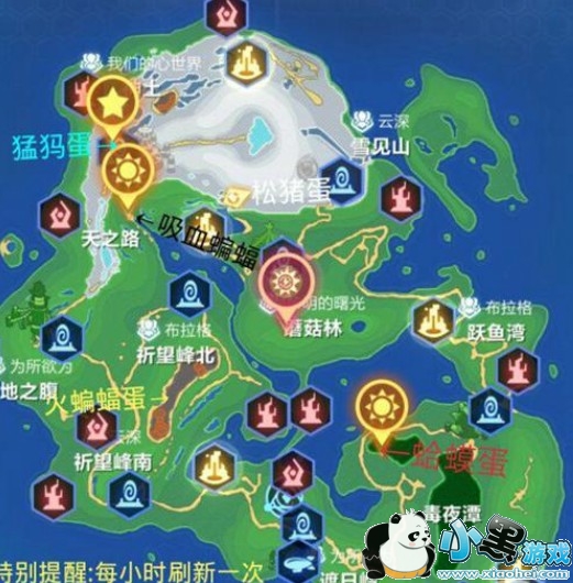 在各地图都有3处固定刷新处,如圣山后,北部矿坑,风火边境,龙巢浅滩等,部分怪物巢穴会刷新宠物蛋,巢穴的样子可以参考蛮足龙巢穴,圣山后面,(地图上位于圣山的上面)。如319猛犸蛋在猛犸象群旁边捡,有些巢穴是树洞。