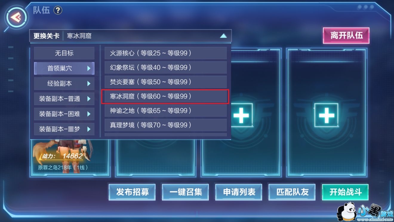 进入的方法则是达到对应的等级在左边任务列表中选择组队,进入组队大厅中能够找到首领巢穴,分别是火源核心,幻象祭坛,焚炎要塞,寒冰洞窟,神谕之地,真理梦境,深谷墓地,罪恶空间。今天为大家详细介绍的是跨时代第四个副本寒冰洞窟。