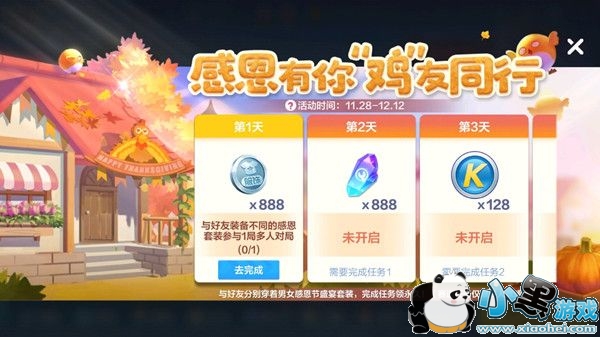 首日挑战的要求是与好友装备不同的感恩套装参与1局多人竞速,注意这里有好友、不同的感恩套装、多人竞速这三项前提,缺少其一都会导致最终无法顺利达成。