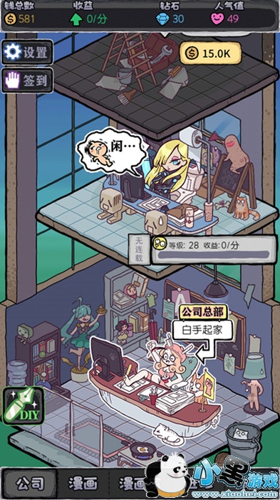 你生活在一个漫画世界中,经营一家漫画摩天大楼,每一层楼都可以画不同种类的漫画,有搞笑、恐怖、魔幻、热血、职场、纯爱等数十种工作室,层层解锁,你能想到的漫画类型这里都有~每个工作室安排的漫画家也都有自己擅长的~搭配出绝世神作也不是梦~