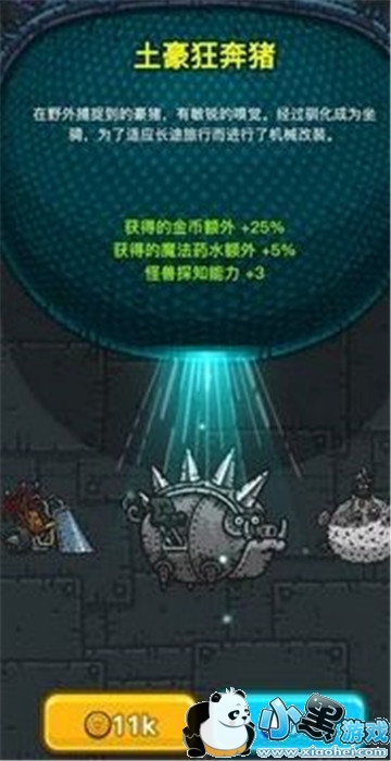 优点:价格便宜,而且还能额外获得25%金币,如:第二关地图翻倍到1000金币的话,土豪猪相当于加了250金币。在前期探索第一张地图时,就可以直接买土豪狂奔猪。