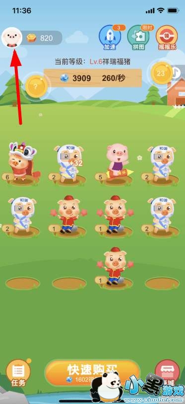 2)用福气值买小猪,小猪生命无限,每秒跳福气值。两个1级小猪合成2级小猪,2个2级合成1个3级。。。无上限,合成N级小猪后,解锁N+1级小猪。