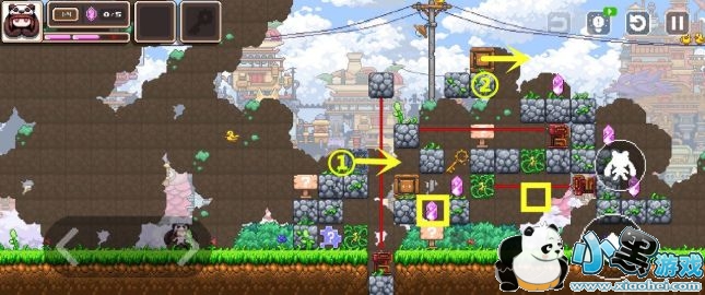 先把①②箱子往右推下去挡住机关,②号箱子要推到藤蔓上方。然后在黄框的两个位置放置幻象,拿到钥匙后进入门内世界。