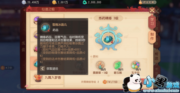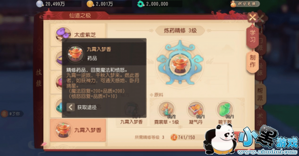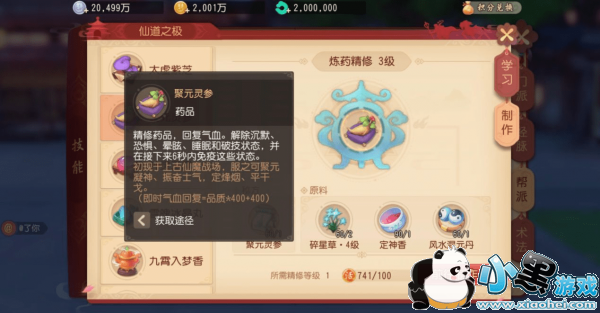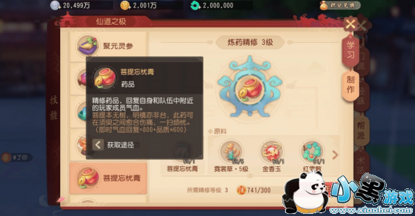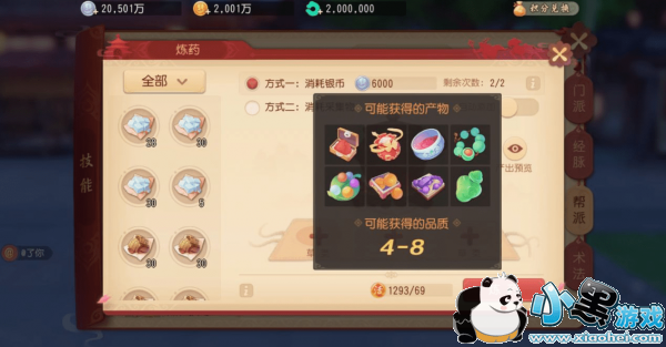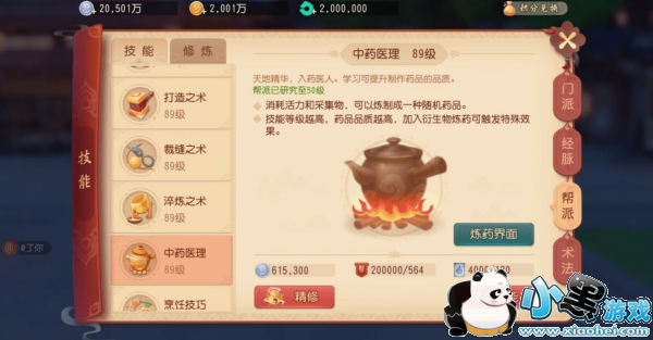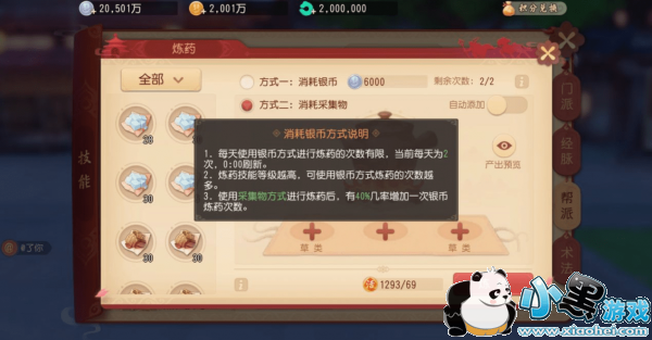炼药技能的学习是在帮派里学习,同样是1级帮派可以快速升级到20级就可以使用了。炼药的界面如下,可以在技能选项里找到。