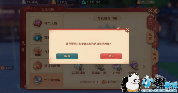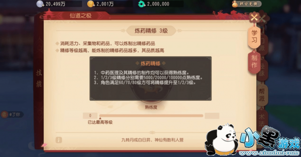 精修制药需要在长安的特定地图,使用炼丹炉制作(就在精修烹饪的旁边)。精修技能一共3 级,等级越高能制作的药品越多,多使用精修制药可以提升熟练度从而升级。