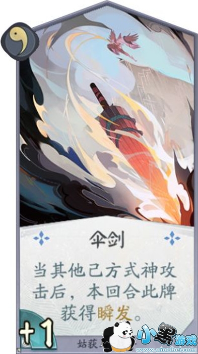 姑获鸟一勾玉战斗牌,伞剑,增加1点力量同时进行攻击,如果配合影翼形态就是增加亮点力量值,是前期抢血的一张很优秀的战斗牌,因为我们瞬发卡没有那么多,所以我们可以在鸩或者以津真天攻击后,使用伞剑攻击的同时,让战斗区原有的式神回到准备区,姑获鸟自己攻击结束后也会回到准备区,让我们的式神没有气绝风险。
