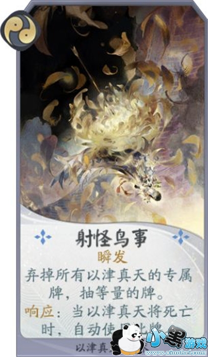 射怪鸟事是二勾玉法术牌,瞬发的效果展示,弃掉所有以津真天的卡牌,抽取等量的卡牌,响应更可以是在以津真天死亡时,自动使用。可以在我们手中没有其他式神卡牌的时候直接使用,其次则是可以在适当的时候卖掉以津真天,触发响应效果展示,让我们可以更加合理的利用所有式神的卡牌。