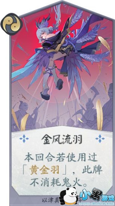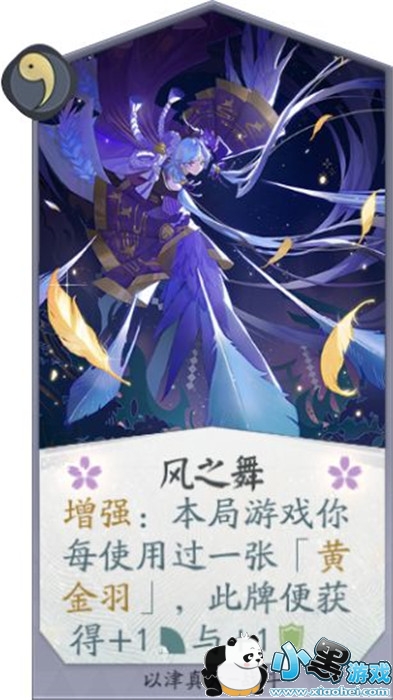 风之舞则是黄金羽收益最大的战斗牌,本身没有任何效果展示,结合以津真天的较低力量值,不太可能没有增强效果展示就直接使用,多数情况下都是用了4,5张黄金羽之后,让这张牌获得5点力量值5点护甲值的加成,不论是用来进攻,增加压制力,还是用来处理敌方战斗区式神,都是风之舞很好的使用方法。