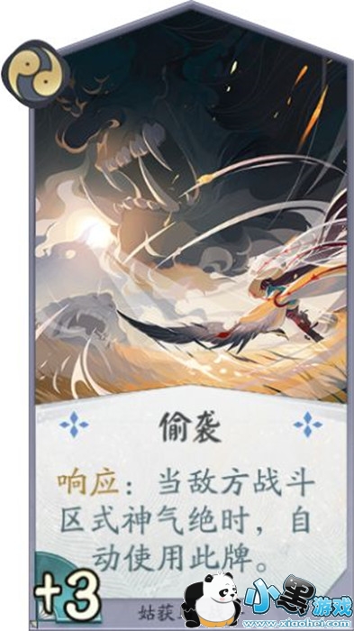 偷袭作为蛊惑鸟的二勾玉战斗牌,直接增加3点力量值,简单直白,可以有效的形成攻势,而响应效果展示则是最好可以触发,留好鬼火,等待对方与我们的式神进行对换,然后自动使用。具体来说不如姑获鸟的SSR,有的话携带SSR即可,这张牌强度还是不如SSR的,属于替补牌。