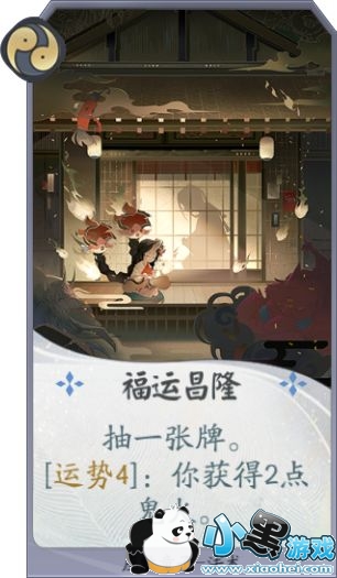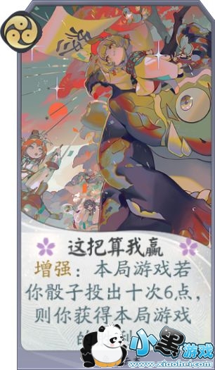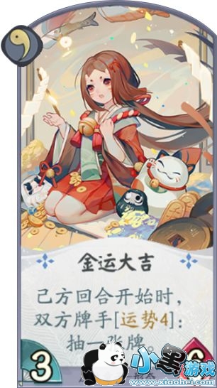 座敷童子的一勾玉形态牌之一,金运大吉。效果展示是自己回合开始两方同时投骰子,运势4的牌手摸一张牌。虽然效果展示看上去有一些不好,作用于双方牌手,很可能对方触发我们就不触发了,但是另一个角度来开,增加了我们每回合的骰子数量,让我们可以更快的完成十6个点的任务,而作为运势套牌我们没有携带萤草等抽牌型式神,所以只能靠座敷童子来抽牌,这样能抽牌的形态牌如何说也是值得携带的,如果对方是快攻卡组可以不用使用,帮助对方摸牌。