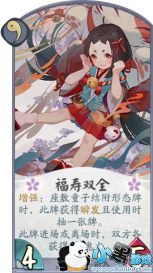座敷童子的最后一张1勾玉形态牌,福寿双全,也是我们可以说是最不亏的一张形态牌,虽然我们没有运势判定效果展示,但是进场双方额外获得鬼火,我们可以增加资源的同时,还有可能把对方不想使用的响应直接触发出来,打乱对方节奏,而如果我们座敷童子身上有其他形态牌,这张牌还是瞬发效果展示并且抽一张牌,可以说是十分强力,况且4力量5生命的身材,才一勾玉回合可以说有些超模,是一张座敷童子一定要携带的卡牌。