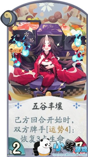 座敷童子的另一张一勾玉形态牌,五谷丰壤。效果展示是自己回合开始双方投骰子,运势4的牌手恢复3点生命。相同于上一张卡牌,虽然效果展示看上去不大优秀,但是另一个角度来说,还是一张可以使用的牌,首先2力量7生命值的身材让我们在对战中1勾玉回合至少承受一次伤害,而且恢复3点生命值,每回合开始都会判定,为我们完成十个6点任务的同时,可以缓解我们生命值的压力,在应对快攻的时候可以直接使用,而如果面对慢速就不要使用,很有可能我们能够率先抢血赢得比赛。